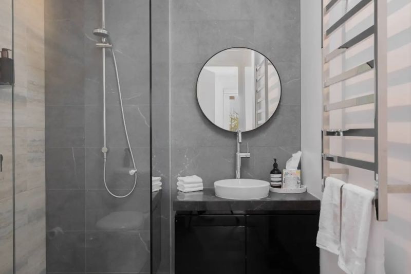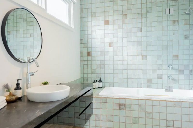 The home also includes a laundry room with a built-in fridge and ample storage options. The main bathroom features a separate shower and bath for added convenience.