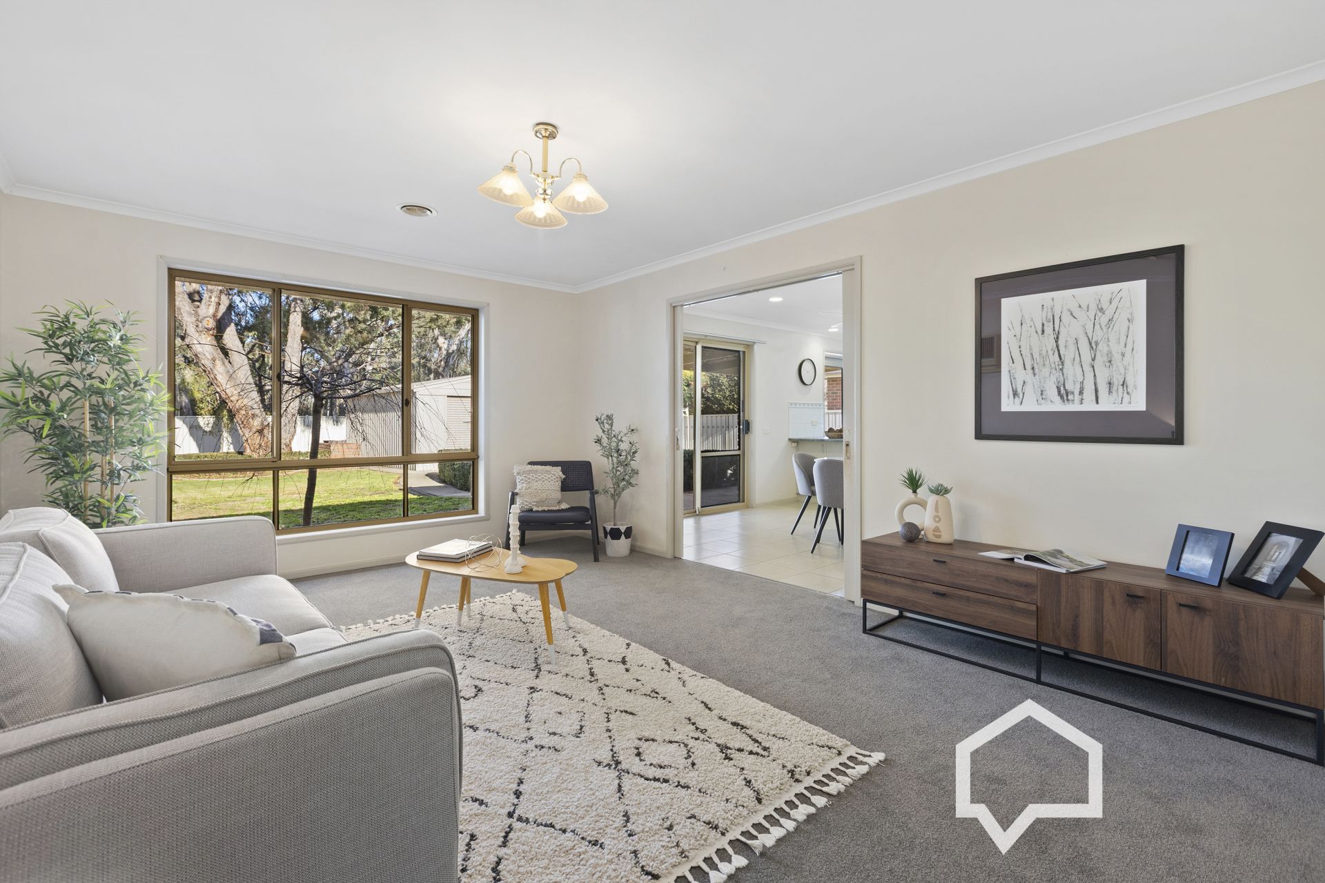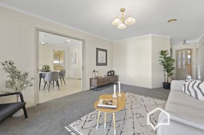 The immaculately presented 90s brick veneer home offers three bedrooms with built-in robes and ceiling fans, two bathrooms, and a central living room adjoining the kitchen/dining area.