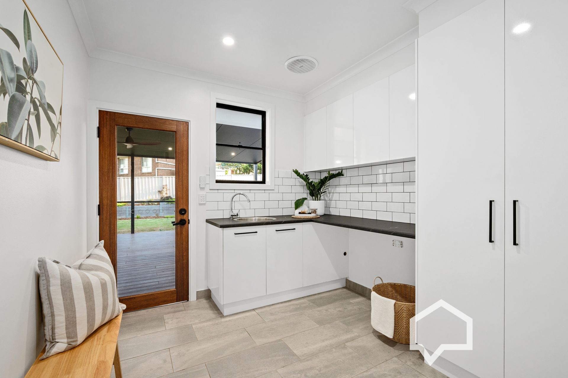 The oversized walk-through laundry with storage cupboards and benches leads to the new ecodeck alfresco area.