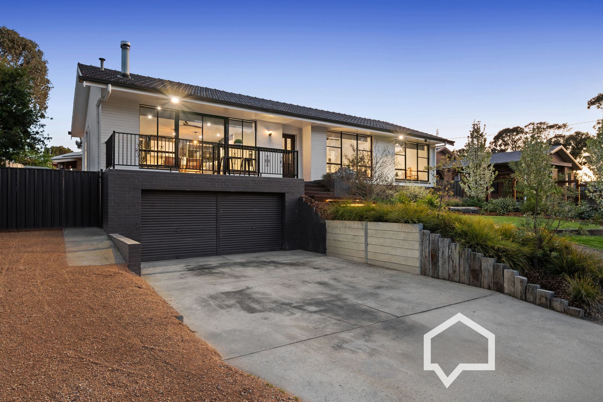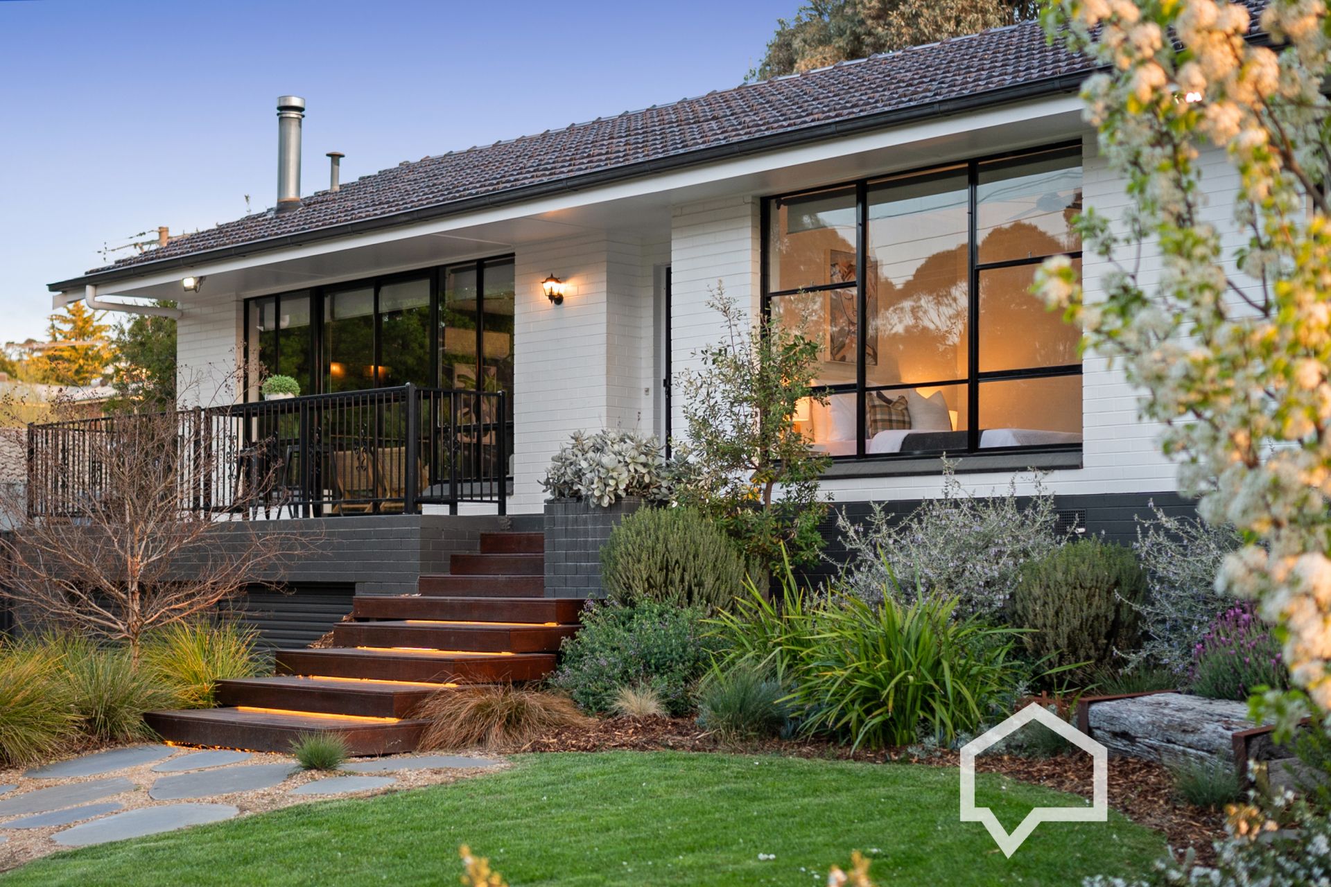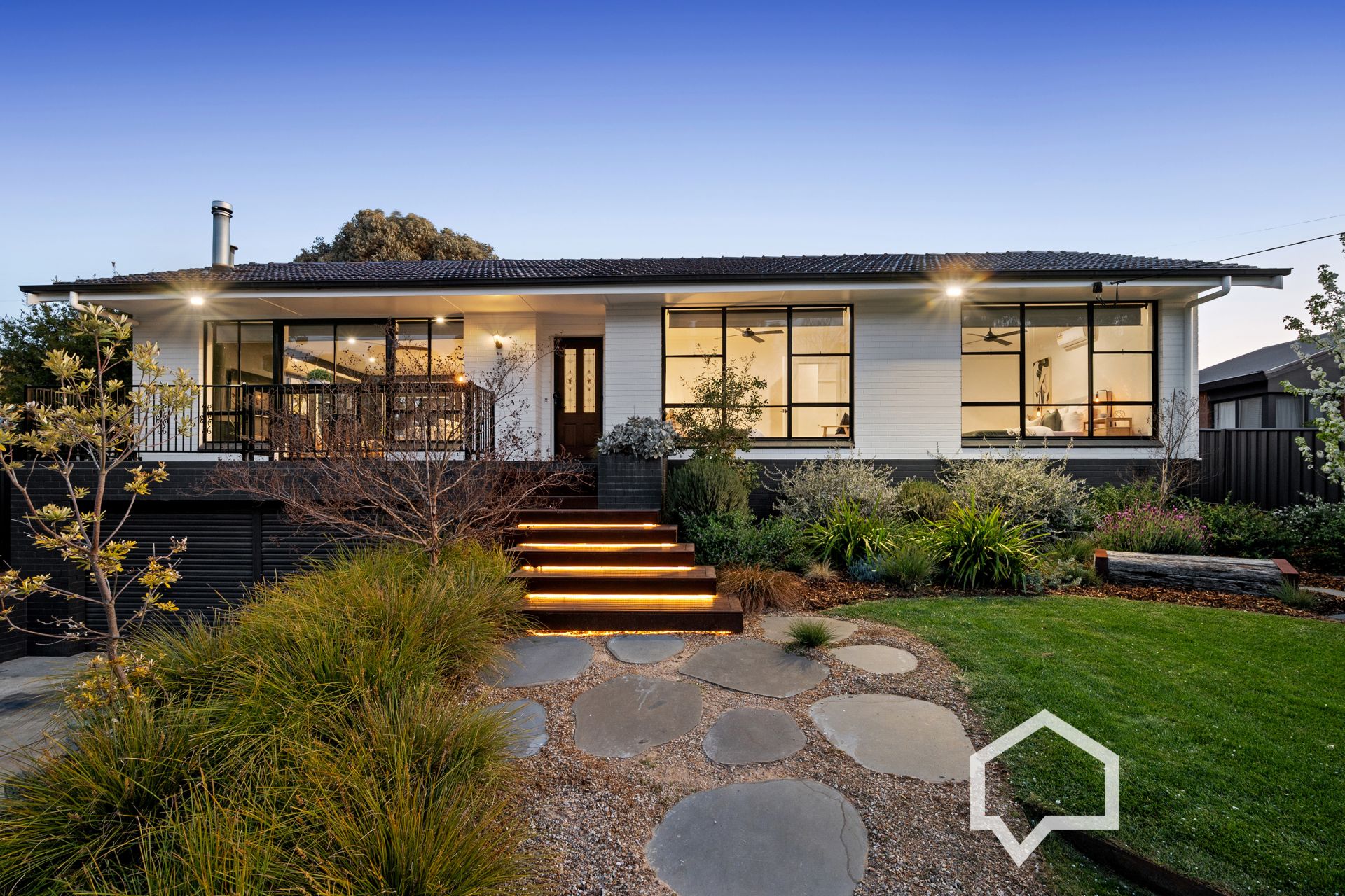 A professional landscaping design has transformed the approx 671m² elevated lot with a sweeping stone path to night-illuminated timber stairs to the front entry. The front garden features hardy shrubbery under flowering ornamental pear trees behind circular lawns with rustic sleeper seating.