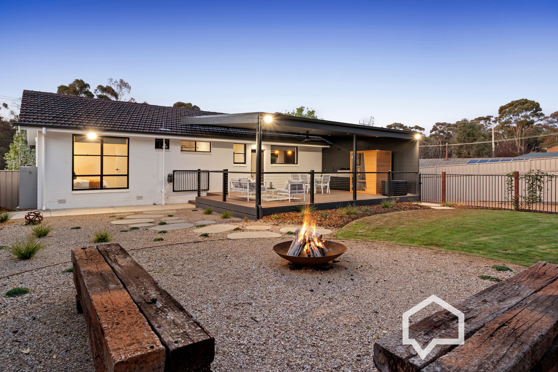 The rear alfresco overlooks the private, recently landscaped backyard featuring a fire pit area, more lush lawns and easy-care perimeter plantings.