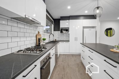 The sleek all-new galley kitchen is ready for budding chefs to test their skills with gas/electric cooking appliances, a Bosch dishwasher, an island bench, ample white cabinetry and a double pantry.