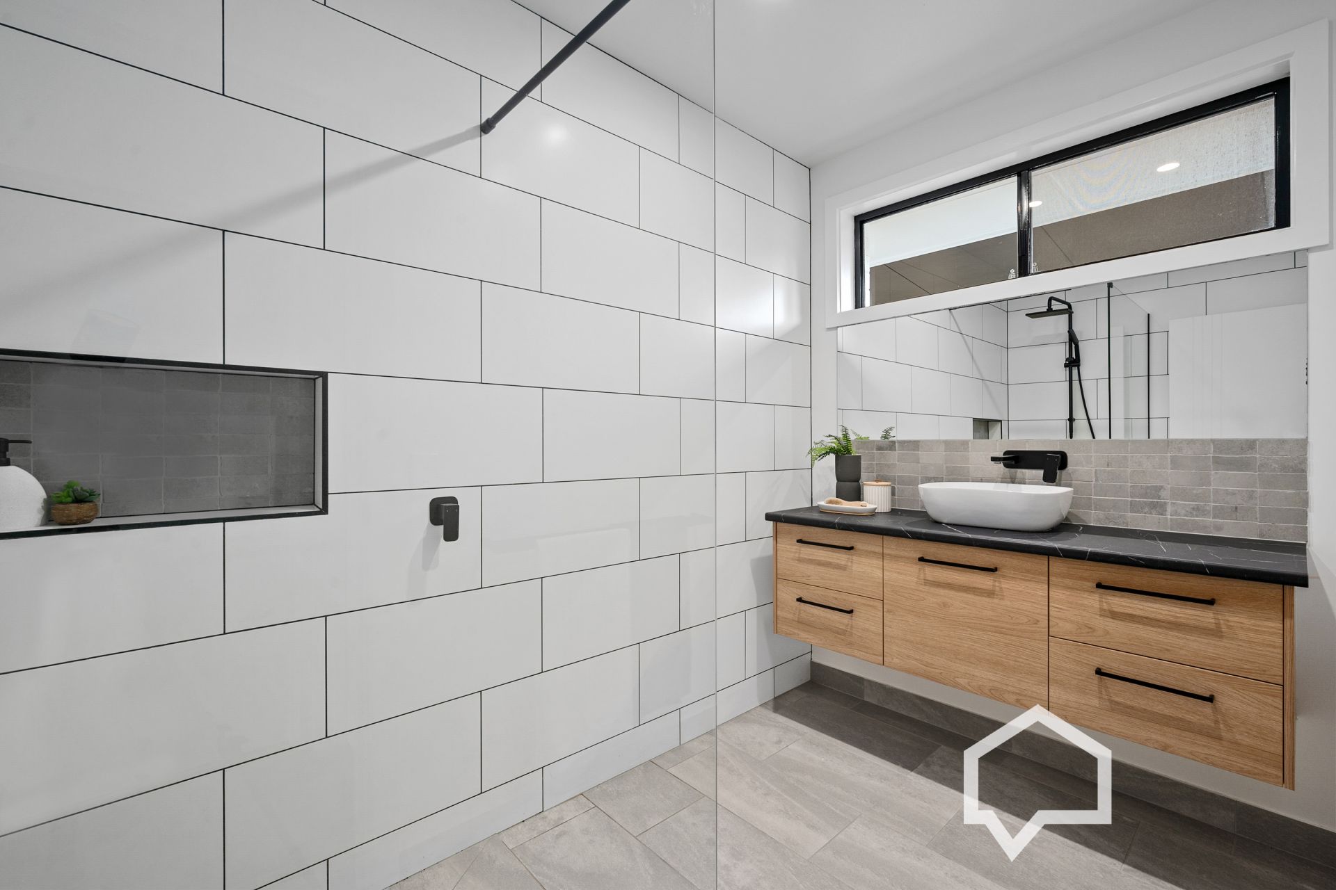 Three bedrooms (all with split system air conditioning units) share the new bathroom with a trendy floating vanity, floor to ceiling tiling and a walk-in shower.