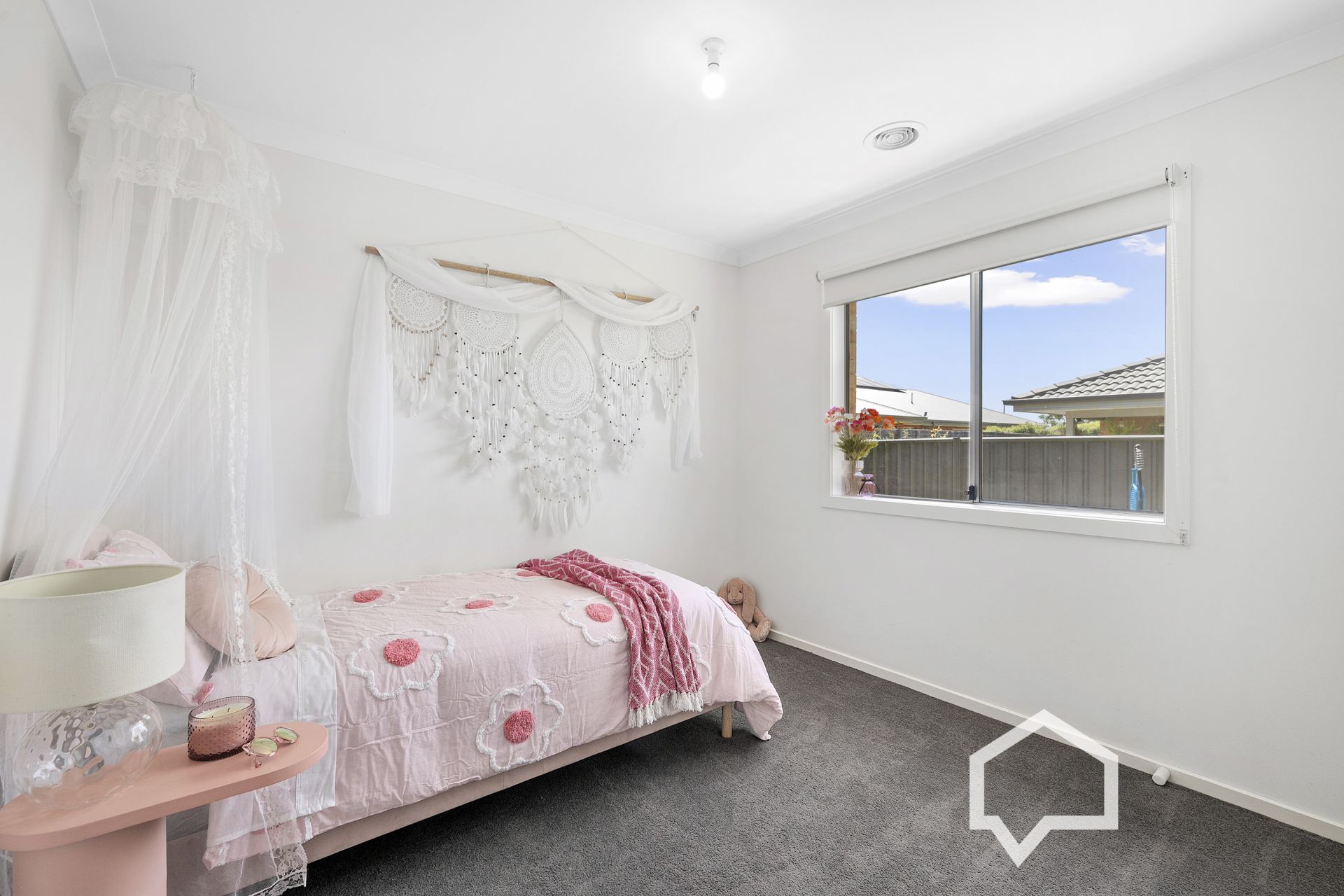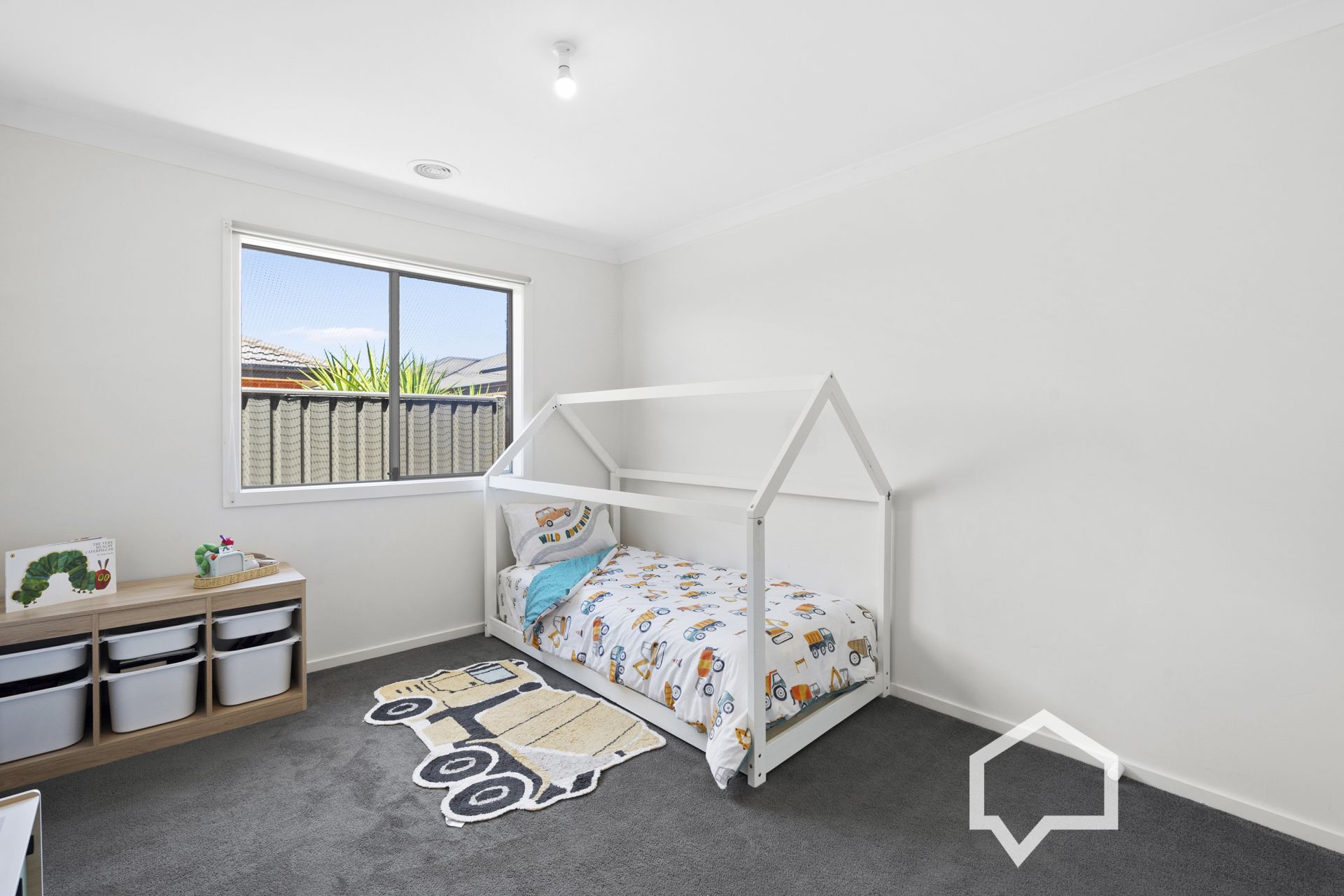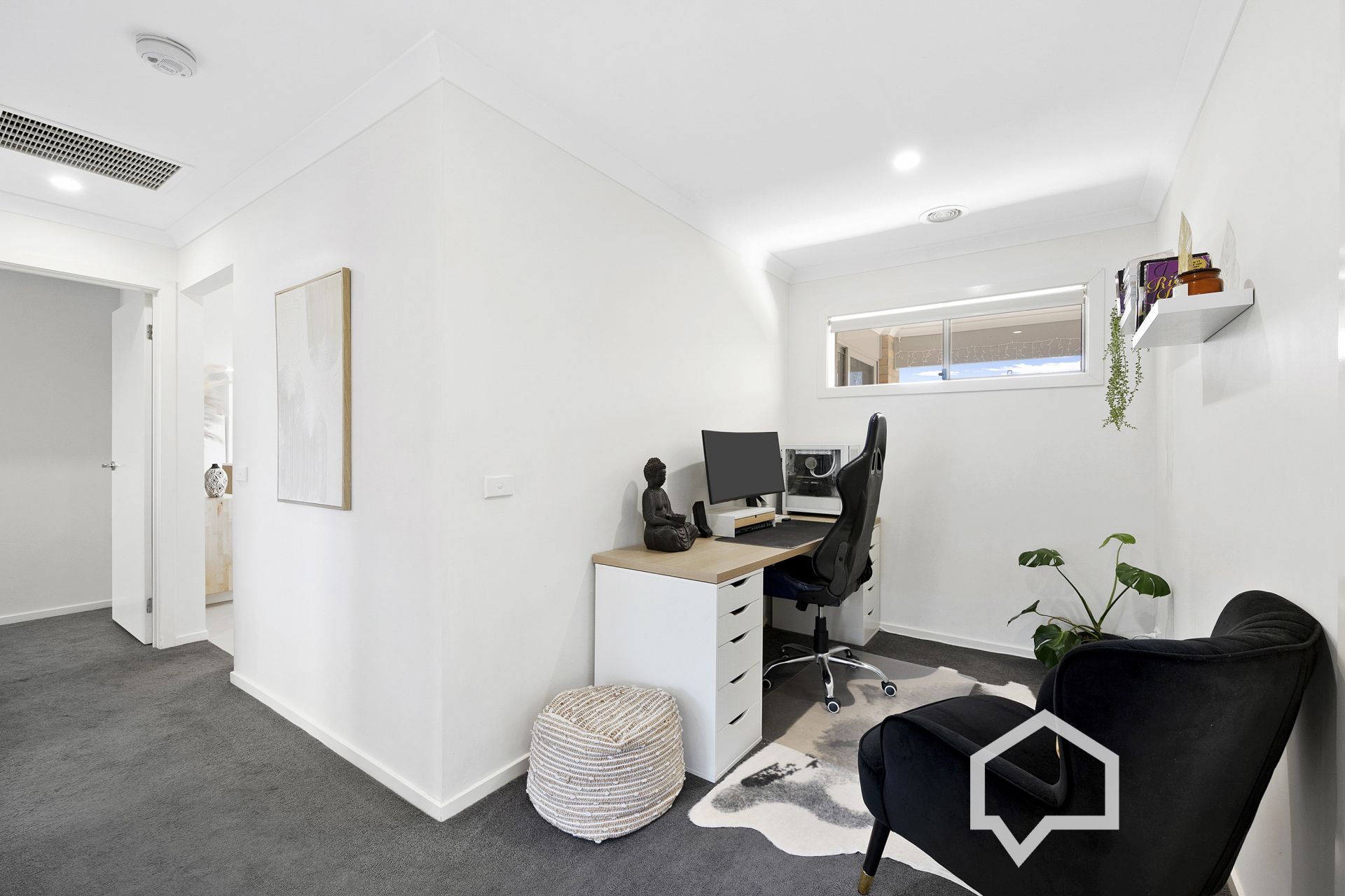 The main bedroom, which includes a walk-in robe and ensuite, is found at the front, with the remaining three bedrooms, a study/play area, the family bathroom and the laundry area positioned together beyond the living zones.