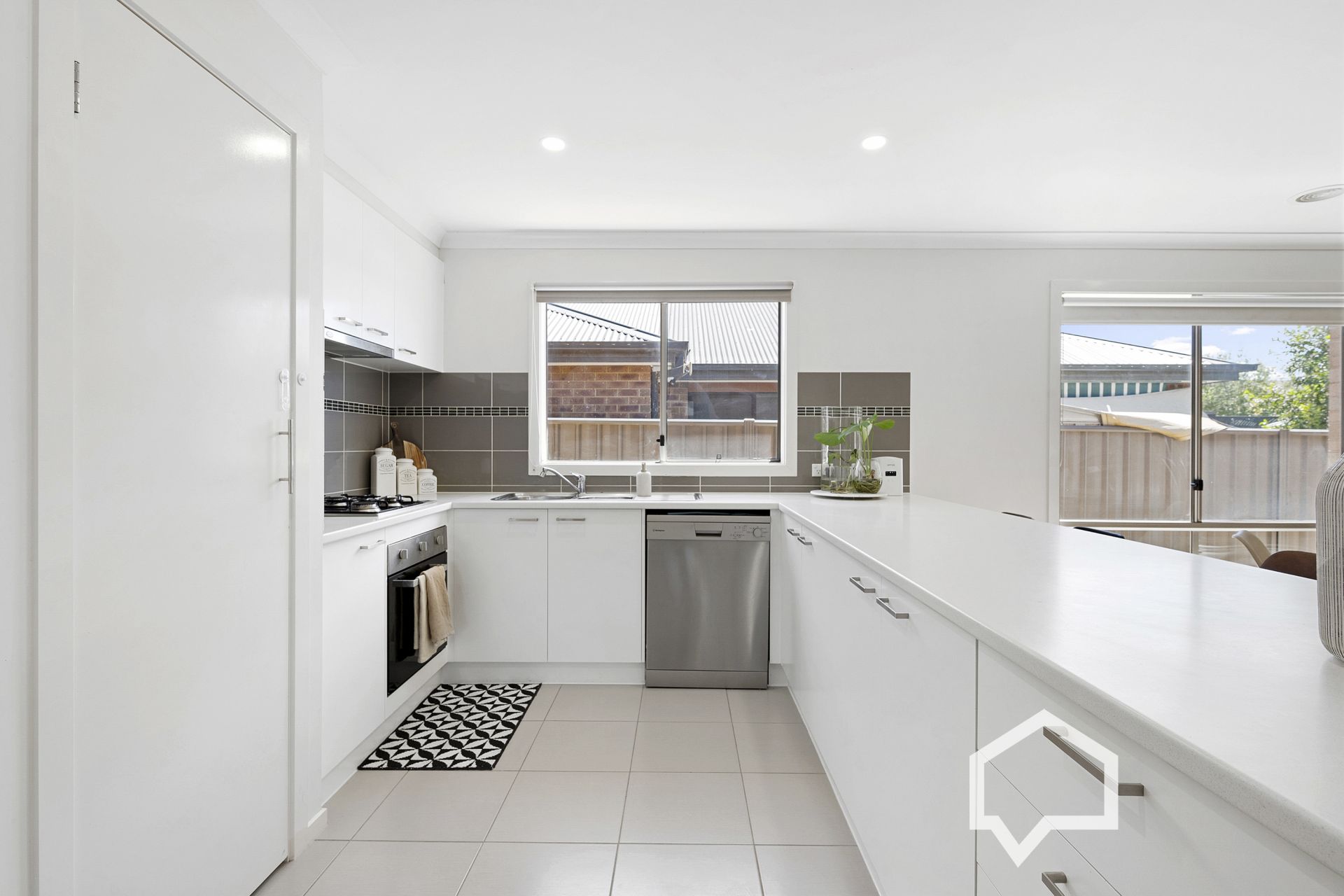 The light-filled kitchen is equipped with a long bench for food preparation and casual dining, gas/electric cooking appliances, a dishwasher, and ample storage including a pantry cupboard.