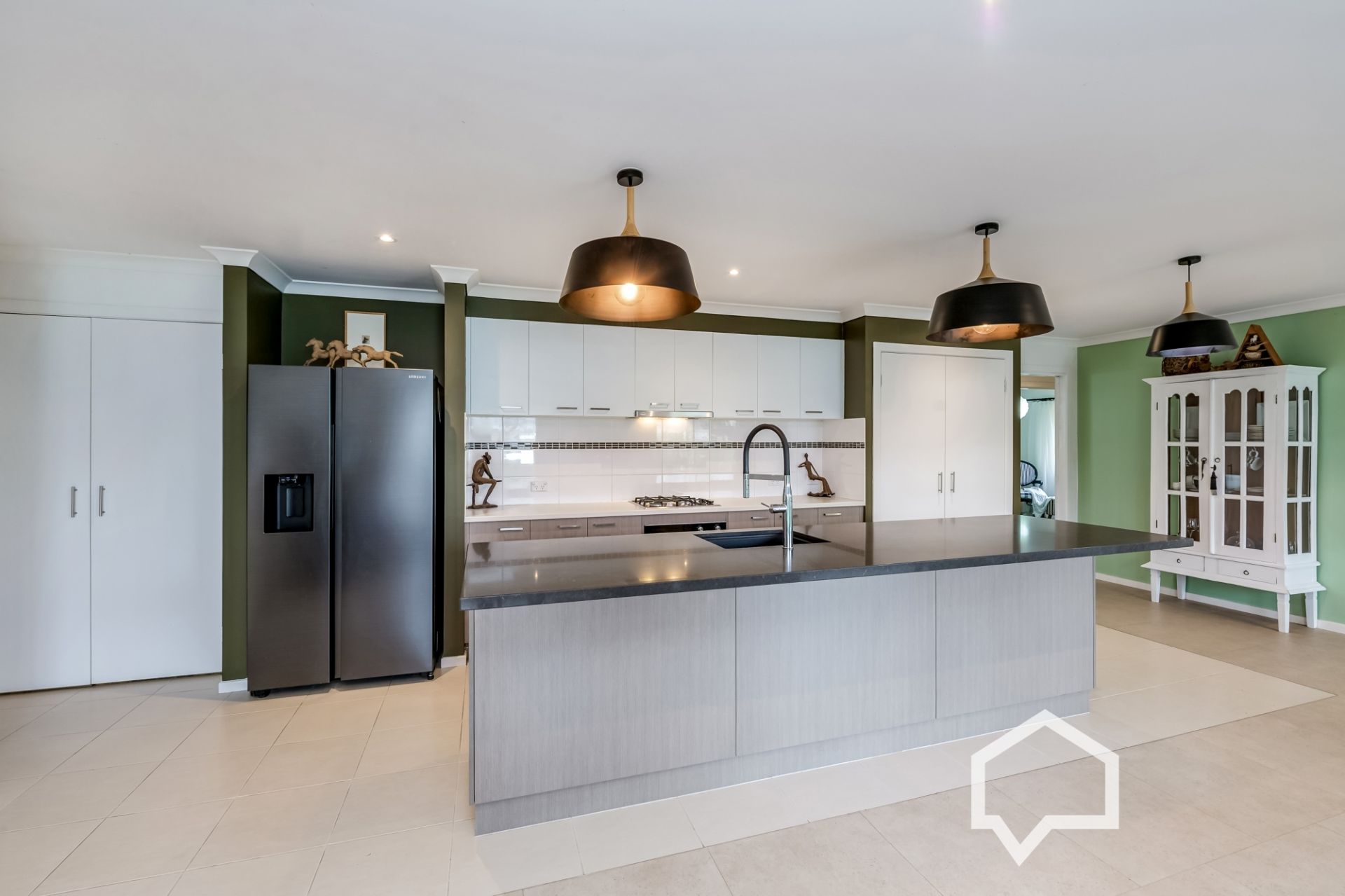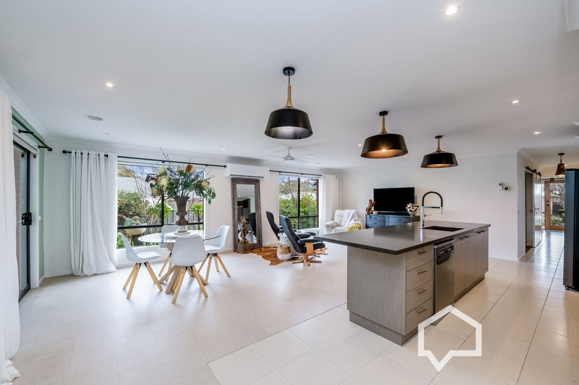 At the heart of the home is the renovated kitchen, thoughtfully designed with meticulous attention to detail. It features a luxurious oversized stone benchtop, premium Fisher & Paykel cooking appliances, a high-end Smeg dishwasher, and double pantries perfect for both entertaining and everyday enjoyment. The adjoining open-plan living and dining area is spacious, bright, and welcoming, enhanced by quality curtains and abundant natural light.