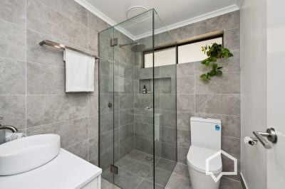 The spacious primary bedroom includes a walk-through robe and updated three-piece ensuite with shower, vanity and toilet.