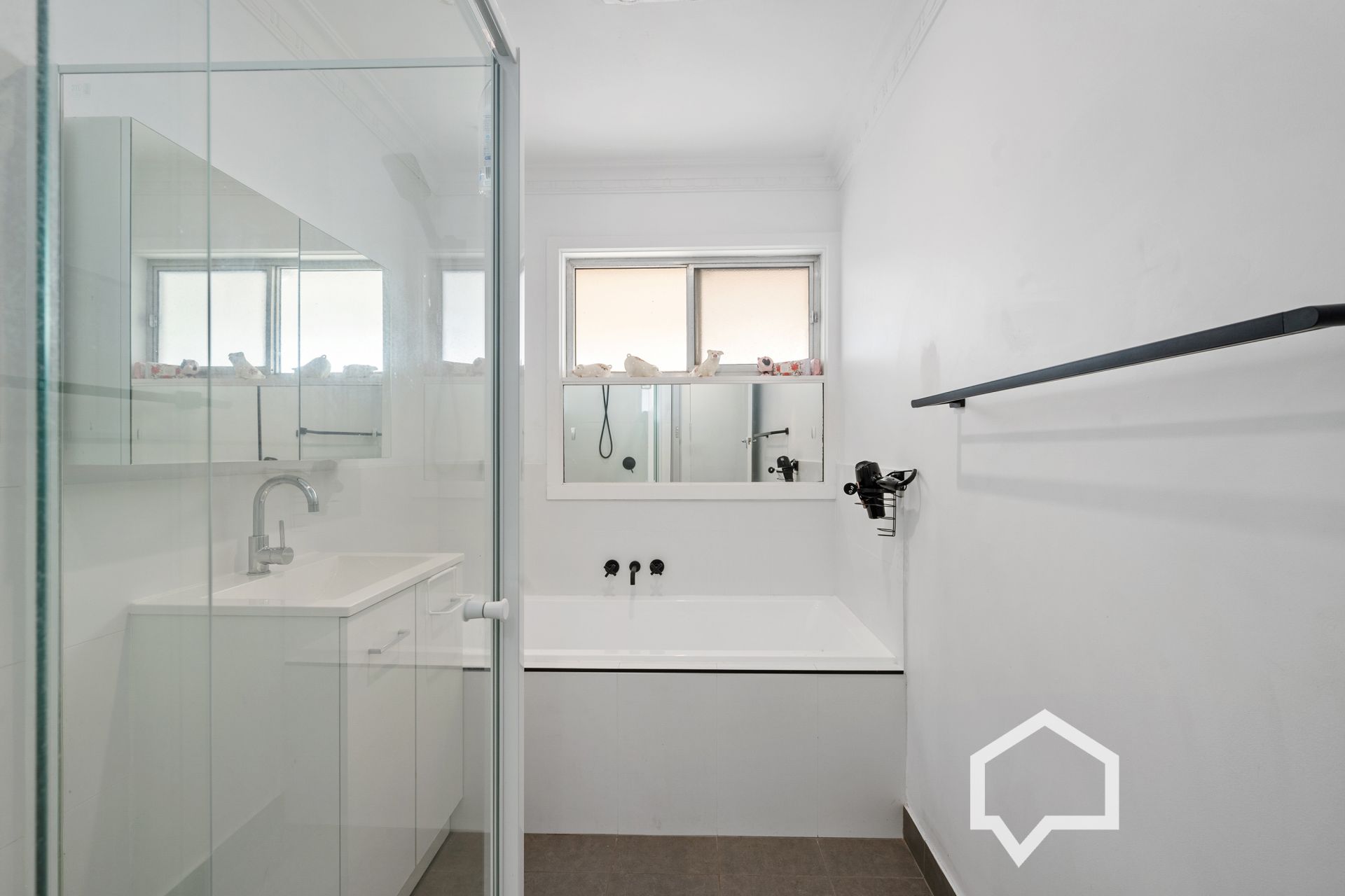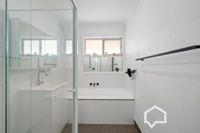Central to all the bedrooms, the renovated, all-white bathroom sparkles with a separate shower recess, a bath and a vanity unit.